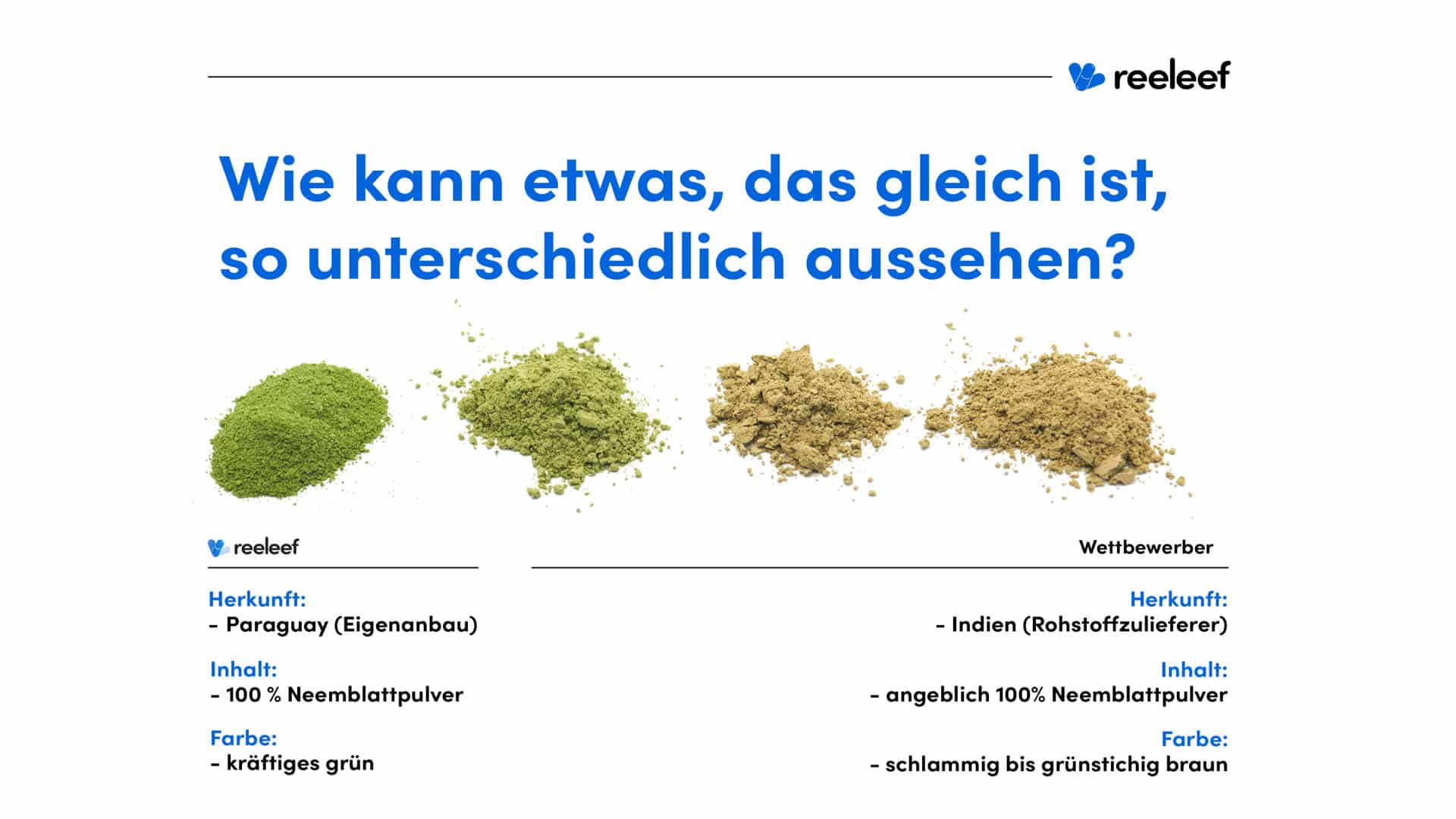 Reeleef steht für ganzheitliche, natürliche Nahrungsergänzung – inspiriert von Ayurveda, wissenschaftlich durchdacht und nachhaltig produziert. Unsere Basis: das Neem-Blattpulver aus kontrolliert biologischem Eigenanbau auf unserer Farm in Paraguay – der größten Neem-Plantage der Welt.