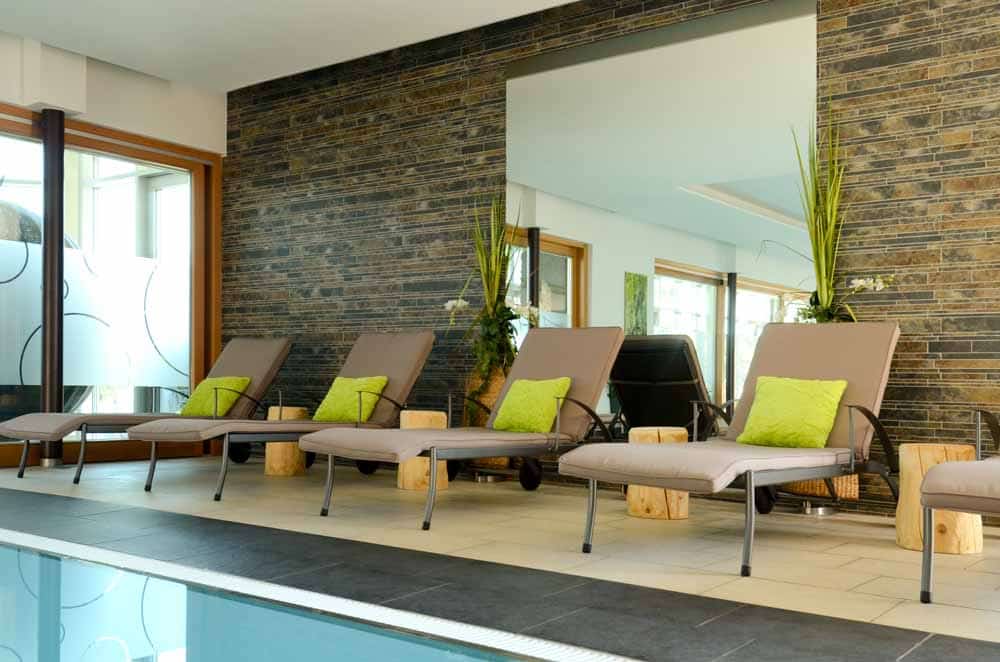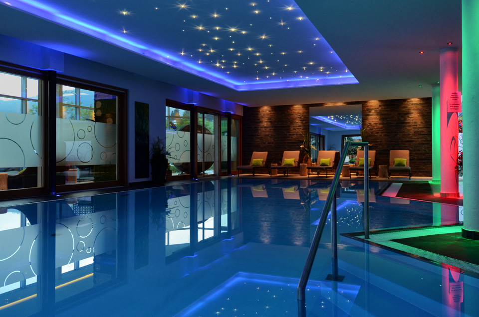 Dezentes Licht, Sternenhimmel und der angenehme Duft von Ölen empfängt Sie im Hallenbad. Beobachten Sie im Winter wie die Schneeflocken vor dem Fenster tanzen, während warmes Wasser aus den Massagedüsen Ihre Rückenmuskulatur verwöhnt.